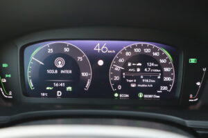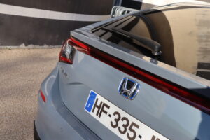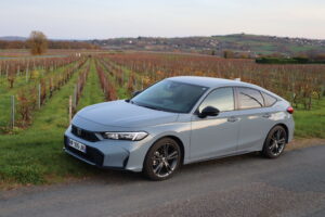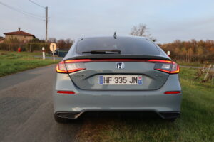Nous avons utilisé la Honda Civic e:EHV en version ‘’Sport’’ pour une utilisation quotidienne sur plus de 1000 kilomètres. Sur autoroute la Civic e:HEV fait valoir son confort, nous sommes dans un environnement agréable et silencieux, les sièges offrent un bon maintient latérale et lombaire, et surprise, en adoptant une conduite souple, on peut rouler de temps à autre en mode 100 % électrique et donc baisser sa consommation d’essence. Sur ce parcours autoroutier (environ 500 km), nous avons consommé 5,5 l/100 km. Nous utilisons au quotidien, en ville et sur route pour vérifier l’intérêt économique de l’hybride. Au fur et à mesure de notre essai, notre Civic e:HEV s’avère très économique, en ville nous roulons à 50 % en mode électrique et sur route, avec le mode récupération d’énergie, notre batterie se recharge et nous permet de rouler de temps à autre en mode électrique et de baisser notre consommation jusqu’à 4,7 l/100 km. Les données du constructeur s’avèrent donc assez juste. Nous avons apprécié l’homogénéité et la polyvalence de notre Honda Civic e:HEV.  Assez sage en utilisation, normale, notre Civic e/HEV peut devenir joueuse en mode sport ;  les cadrans passent au rouge, dans cette configuration, la une tenue de route irréprochable, aidé par un train avant précis et un duo châssis, suspensions très efficaces.