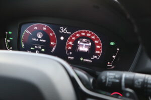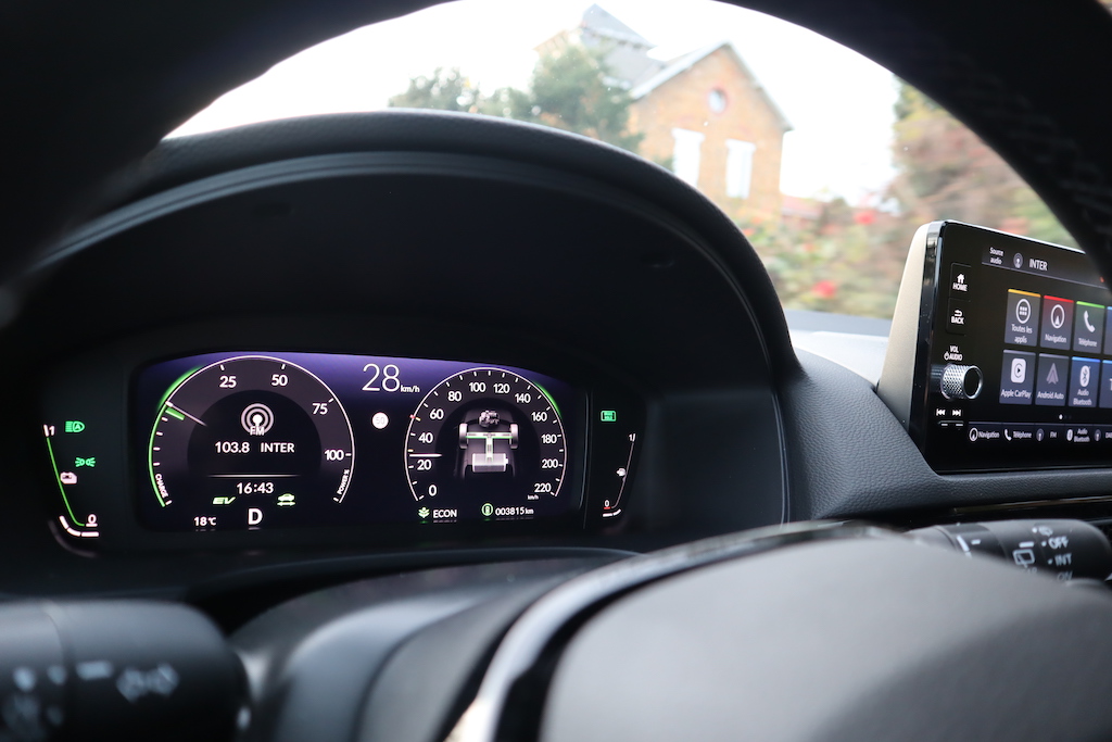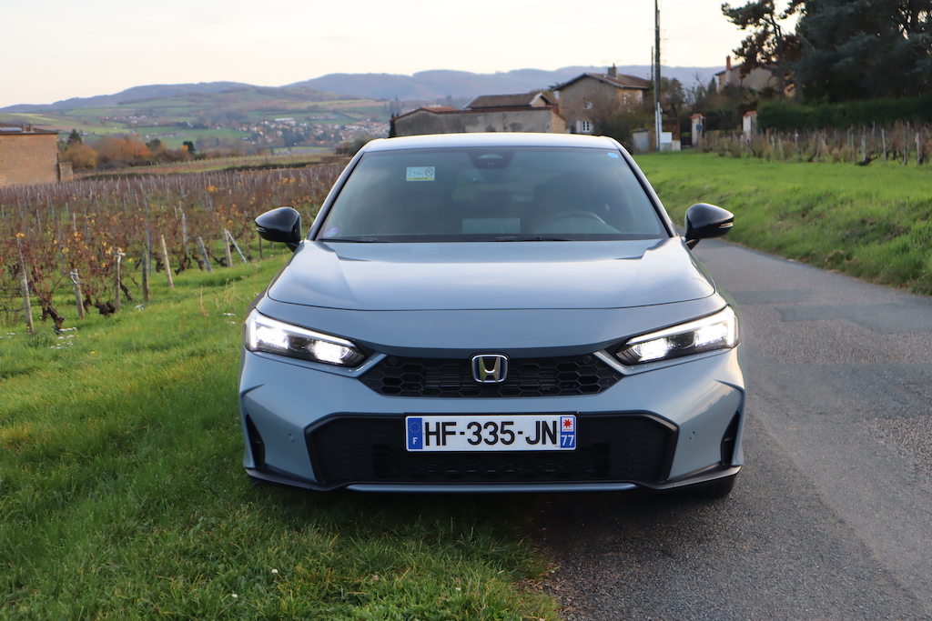 Nous avons utilisé la Honda Civic e:EHV en version ‘’Sport’’ pour une utilisation quotidienne sur plus de 1000 kilomètres. Sur autoroute la Civic e:HEV fait valoir son confort, nous sommes dans un environnement agréable et silencieux, les sièges offrent un bon maintient latérale et lombaire, et surprise, en adoptant une conduite souple, on peut rouler de temps à autre en mode 100 % électrique et donc baisser sa consommation d’essence. Sur ce parcours autoroutier (environ 500 km), nous avons consommé 5,5 l/100 km. Nous utilisons au quotidien, en ville et sur route pour vérifier l’intérêt économique de l’hybride. Au fur et à mesure de notre essai, notre Civic e:HEV s’avère très économique, en ville nous roulons à 50 % en mode électrique et sur route, avec le mode récupération d’énergie, notre batterie se recharge et nous permet de rouler de temps à autre en mode électrique et de baisser notre consommation jusqu’à 4,7 l/100 km. Les données du constructeur s’avèrent donc assez juste. Nous avons apprécié l’homogénéité et la polyvalence de notre Honda Civic e:HEV.  Assez sage en utilisation, normale, notre Civic e/HEV peut devenir joueuse en mode sport ;  les cadrans passent au rouge, dans cette configuration, la une tenue de route irréprochable, aidé par un train avant précis et un duo châssis, suspensions très efficaces.