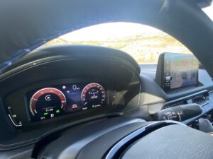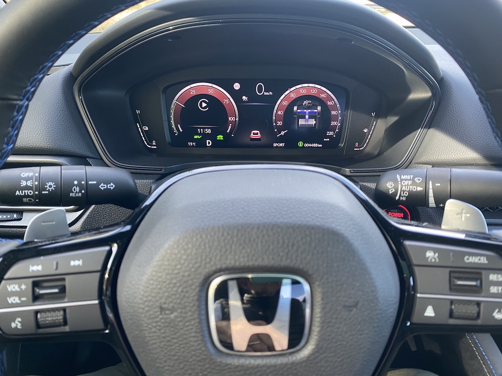 A l’Intérieur, l’habitacle est conforme à celui d’une GT, un design épuré mais fonctionnel. Les sièges du conducteur et du passager avant présentent des différences subtiles. Pour le conducteur, la base du siège est dotée de renforts latéraux et d’un rembourrage plus ferme, garantissant au conducteur un meilleur maintien latéral en cas de conduite dynamique. Pour le passager, l’accent a été mis sur la fonctionnalité avec des renforts latéraux plus souples. Le tableau de bord numérique de 10,2 pouces fournit toutes les informations nécessaires à une conduite optimisée, accélérations, recharge batterie, conduite en mode électrique ou thermique et niveau de consommation. La console centrale propose le sélecteur de mode de conduite qui permet d’alterner aisément entre quatre options : « Confort », « GT », « Sport » et « Individual » ainsi que la touche S+ Shift de Honda, qui offre,