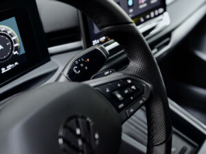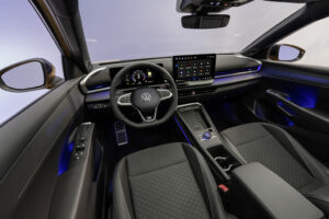 L’intérieur a été considérablement amélioré et impressionne par sa qualité, ses surfaces douces et ses technologies innovantes. Par exemple, le tableau de bord est recouvert d’un tissu développé pour ce véhicule, ce qui crée une atmosphère de style salon avec l’éclairage d’ambiance. Le Nouveau T-Roc adopte de nombreuses caractéristiques des modèles Tiguan et Tayron, telles que la dernière évolution de la molette Drive Select, qui peut être utilisée pour sélectionner des profils de conduite et contrôler le volume, entre autres. L’affichage tête haute sur le pare-brise (en option) constitue également une nouveauté sur le Nouveau T-Roc. Il projette des informations importantes telles que la vitesse ou les informations de navigation directement sur le pare-brise devant le conducteur.