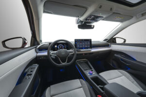 L’intérieur a été considérablement amélioré et impressionne par sa qualité, ses surfaces douces et ses technologies innovantes. Par exemple, le tableau de bord est recouvert d’un tissu développé pour ce véhicule, ce qui crée une atmosphère de style salon avec l’éclairage d’ambiance. Le Nouveau T-Roc adopte de nombreuses caractéristiques des modèles Tiguan et Tayron, telles que la dernière évolution de la molette Drive Select, qui peut être utilisée pour sélectionner des profils de conduite et contrôler le volume, entre autres. L’affichage tête haute sur le pare-brise (en option) constitue également une nouveauté sur le Nouveau T-Roc. Il projette des informations importantes telles que la vitesse ou les informations de navigation directement sur le pare-brise devant le conducteur.